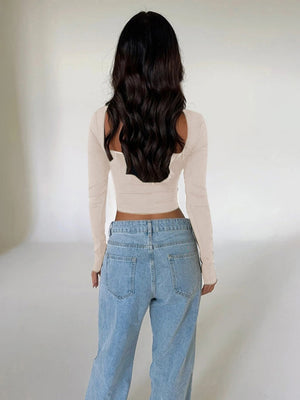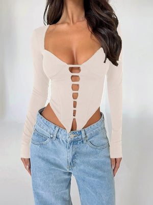 White V-Neck Solid Long Sleeves Polyester Casual Top