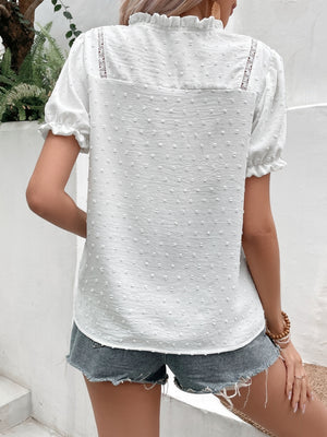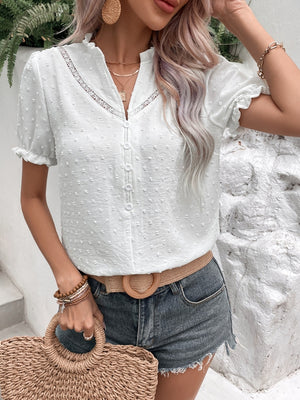 Introducing our White V-Neck Solid Short Sleeves Polyester Top, a stylish and versatile addition to your wardrobe. Made from high-quality polyester fabric, this top offers a comfortable and breathable fit. The v-neck design adds a touch of elegance, while the black color provides a timeless and sophisticated look.