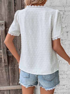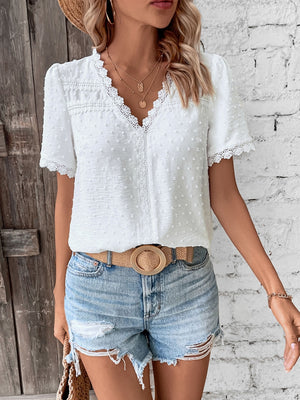This white top features a v-neck and short sleeves, making it a versatile addition to any wardrobe. The solid color allows for easy pairing with various bottoms and accessories, perfect for creating both casual and formal looks.