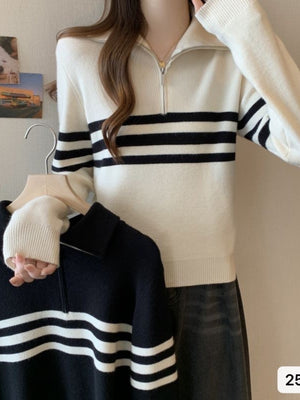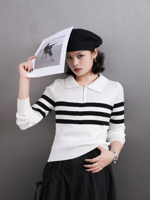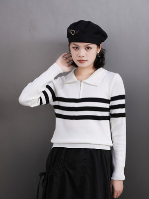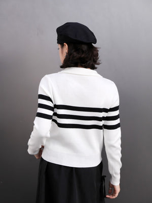 White Viscose Rayon Shirt Collar Long Sleeves Horizontal Stripes Top