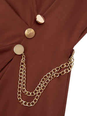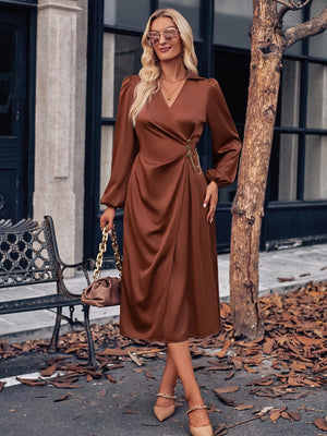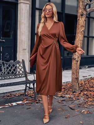 This elegant brown knee length dress features a classic v-neck and long sleeves, making it a versatile and timeless addition to any wardrobe.