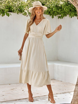 This elegant A-Line dress is made from high-quality cream polyester, perfect for any occasion. The flattering silhouette and versatile color make it a must-have in any wardrobe. The dress features a classic v-neck neckline and a comfortable fit that will make you feel confident and stylish.