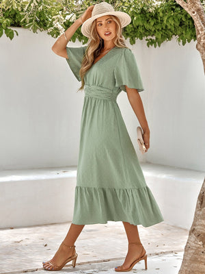 This elegant A-Line dress is made from high-quality green polyester, perfect for any occasion. The flattering silhouette and versatile color make it a must-have in any wardrobe. The dress features a classic v-neck neckline and a comfortable fit that will make you feel confident and stylish.