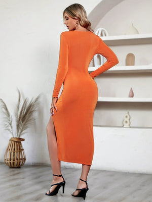 Women Orange Polyester Bodycon Slit Dress