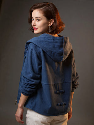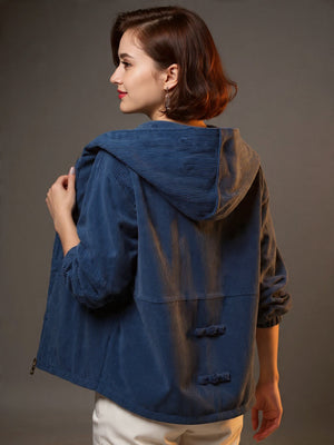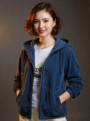 Blue solid open front jacket, has a hood, 2 pockets, zip closure, long sleeves, straight hemline, without lining