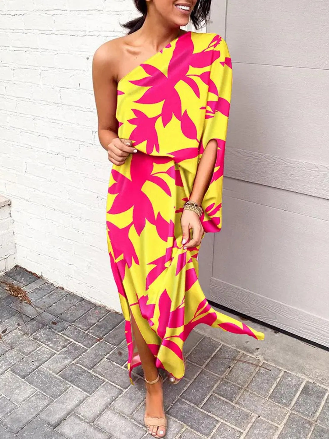 Yellow One Shoulder Floral Sleeveless A-Line Polyester Maxi Dress