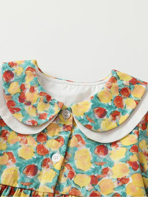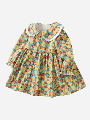 Yellow Round Neck Casual A-Line Floral Long Sleeves Knee Length Cotton Dress