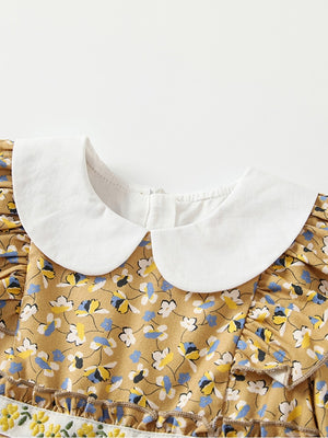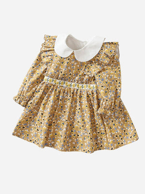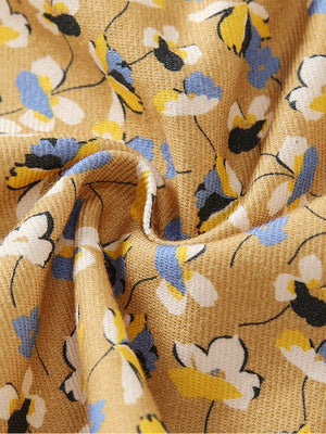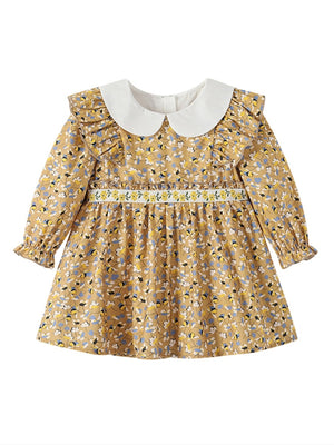 Yellow Round Neck Casual A-Line Floral Long Sleeves Knee Length Cotton Dress
