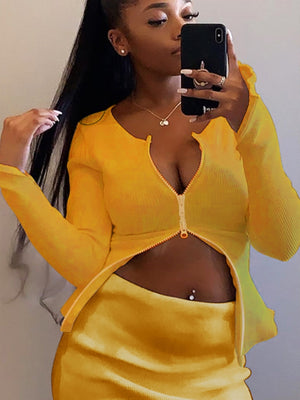 Yellow Round Neck Long Sleeves Polyester Top & Skirt Set