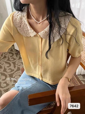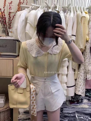 Yellow Shirt Collar Short Sleeves Solid Regular Sleeves Viscose Rayon Top