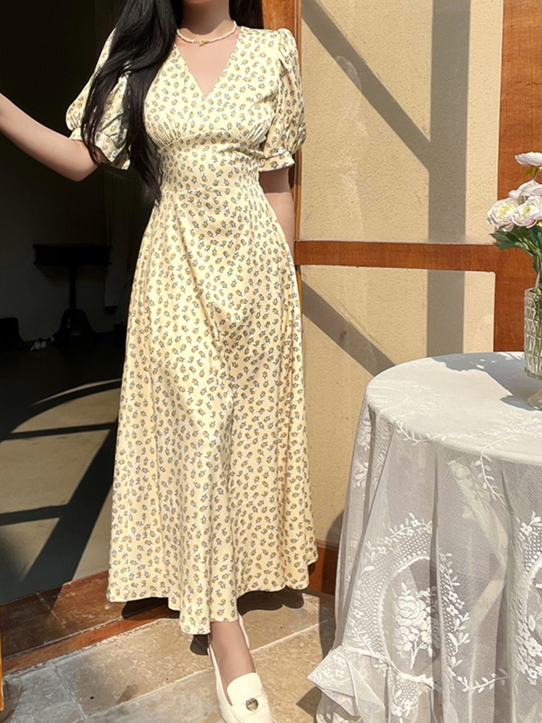 Embrace timeless style and make a statement with our yellow v-neck abstract short sleeves maxi a-line polyester dress. Pair it with heels and accessories for a sophisticated look or dress it down with flats for a more relaxed vibe.