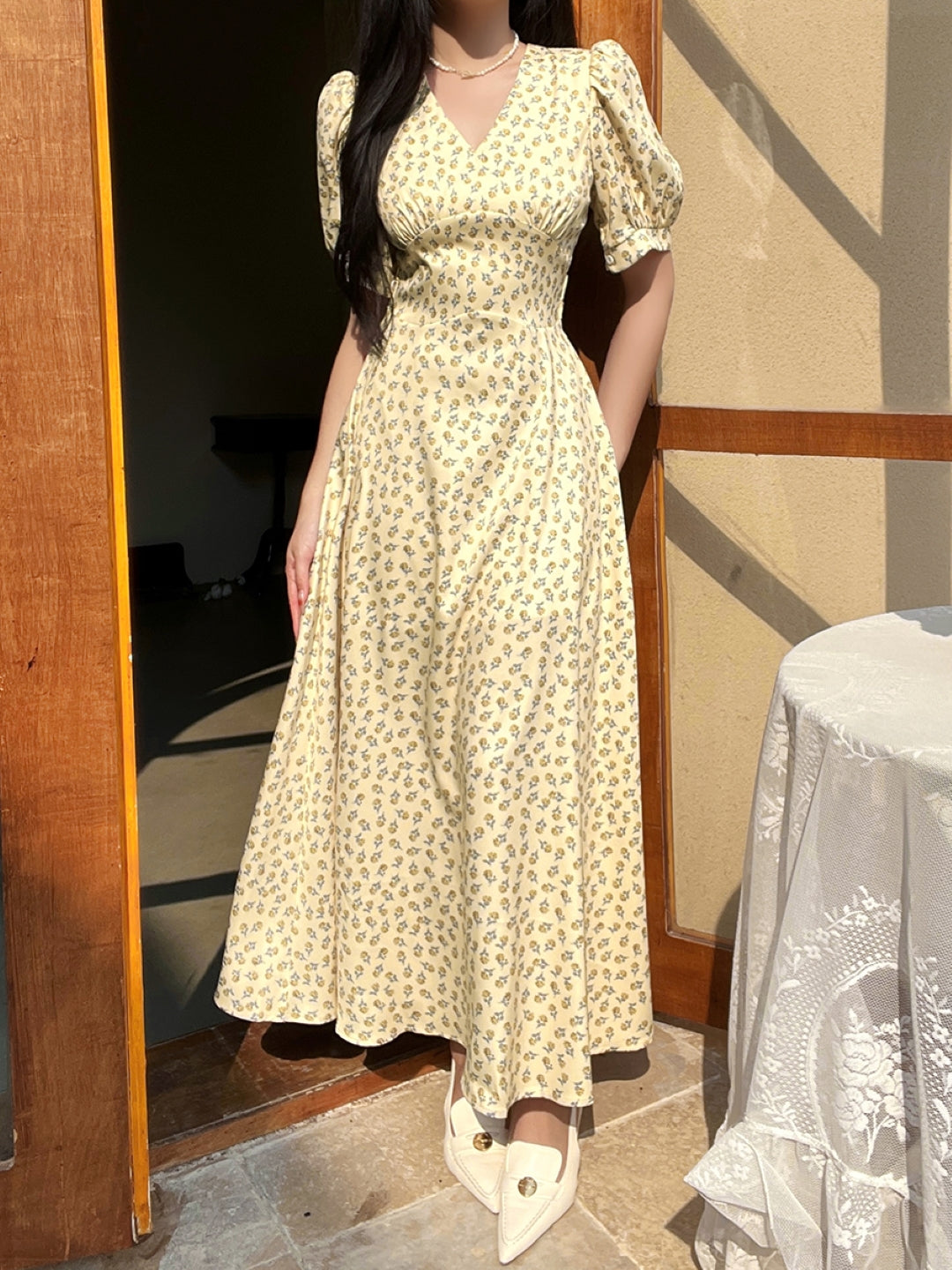 Yellow V-Neck Abstract Short Sleeves Maxi A-Line Polyester Dress